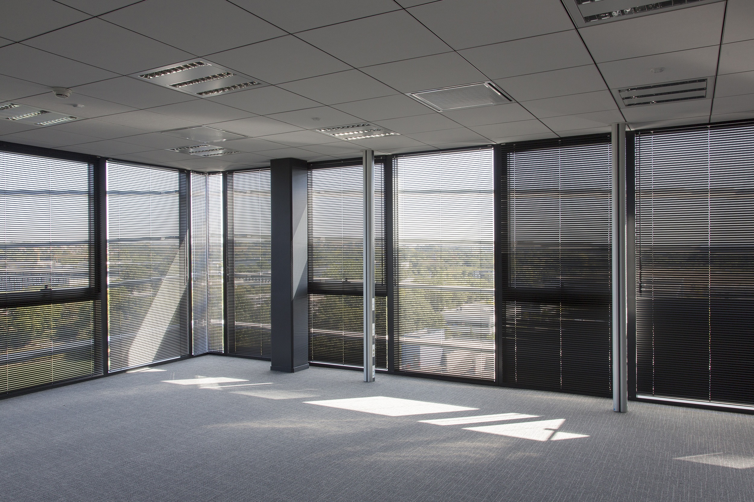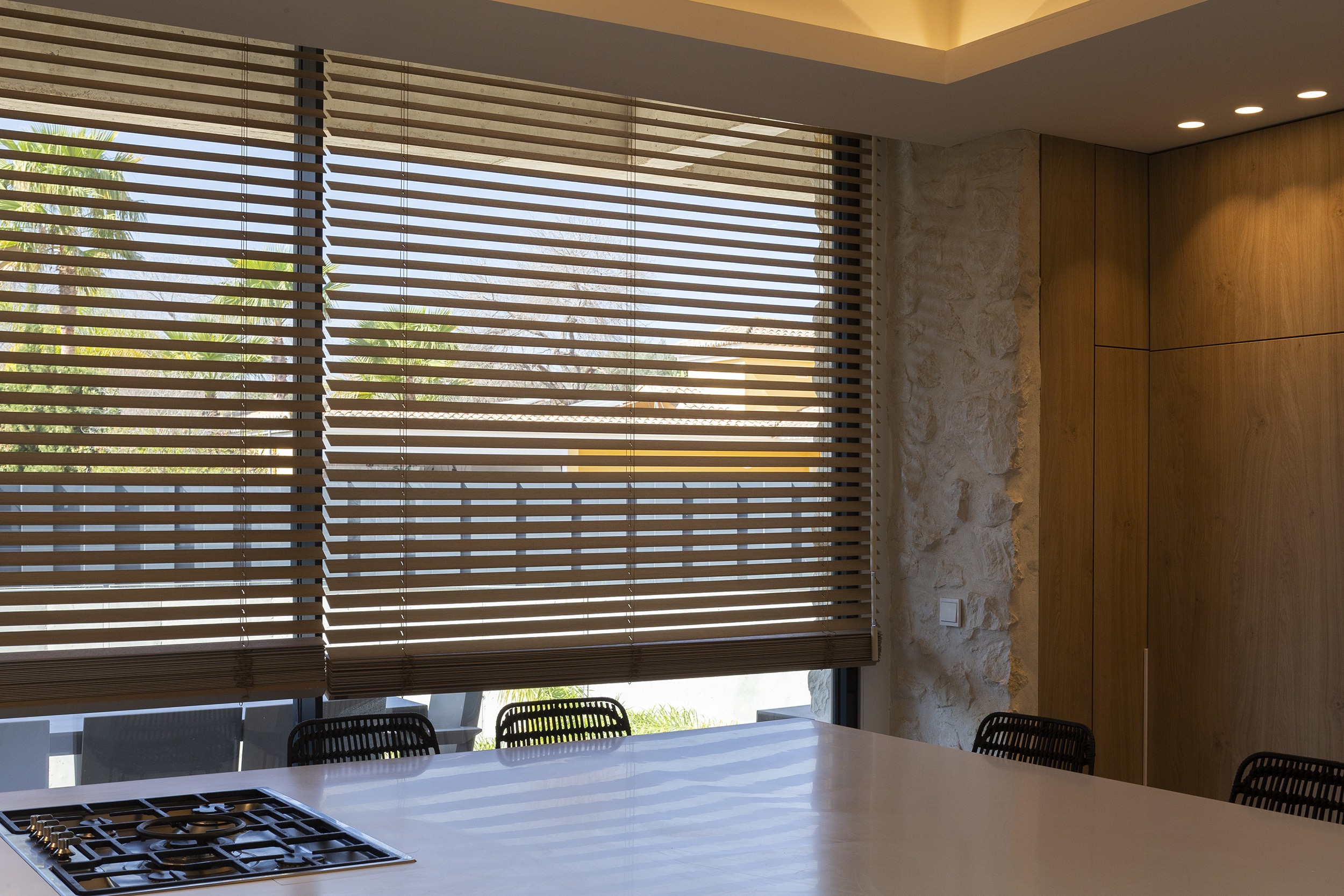 The Venetian blind is a practical and functional option that allows precise control of the amount of light entering a space. This system combines the clarity of full opening with the ability to achieve high opacity when fully extended, thanks to its adjustable slats of different widths that rotate 180° on their horizontal axis.