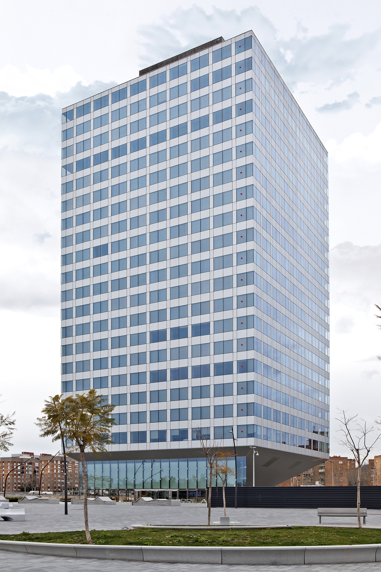 The space is optimized around a functional core, leaving large open areas with fully glazed façades on all four sides. The entrance hall is a spacious common area that allows visual connection with the surroundings. The O-Box shades stand out as a distinctive architectural feature on the glazed façade.