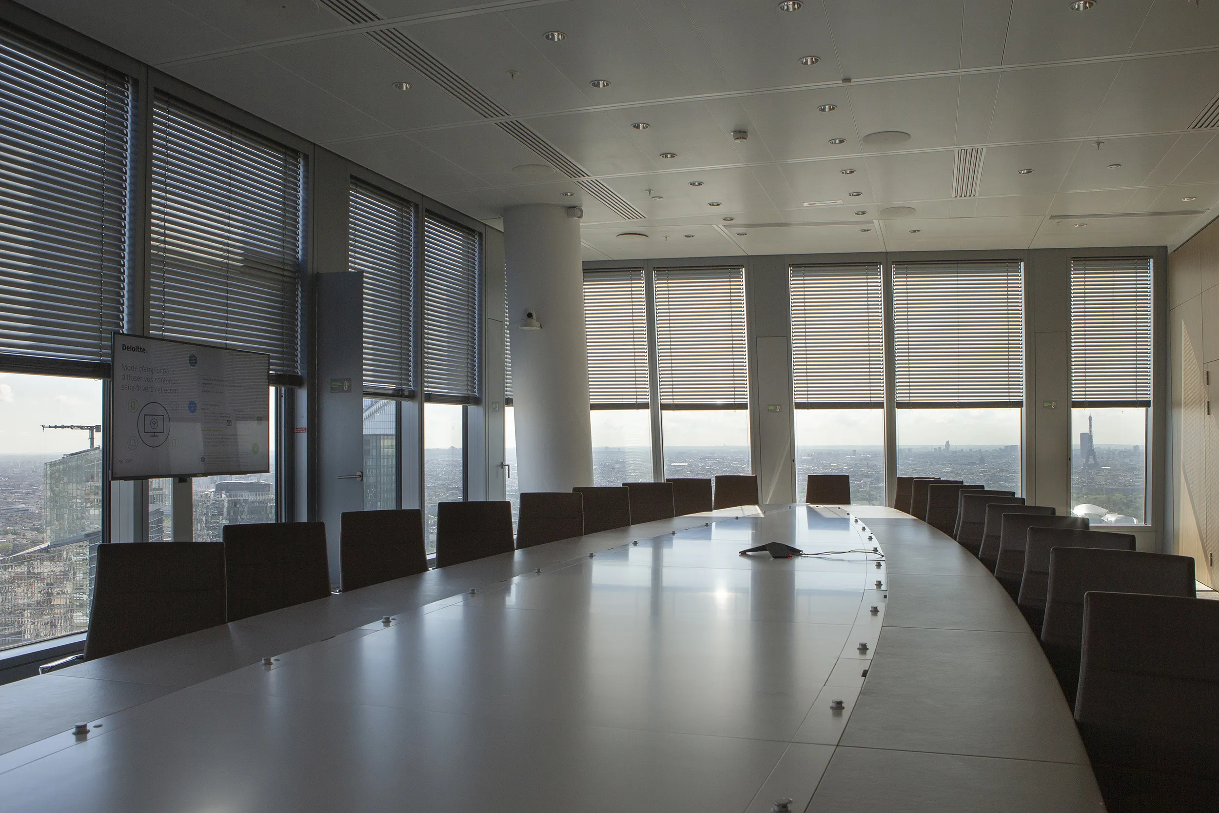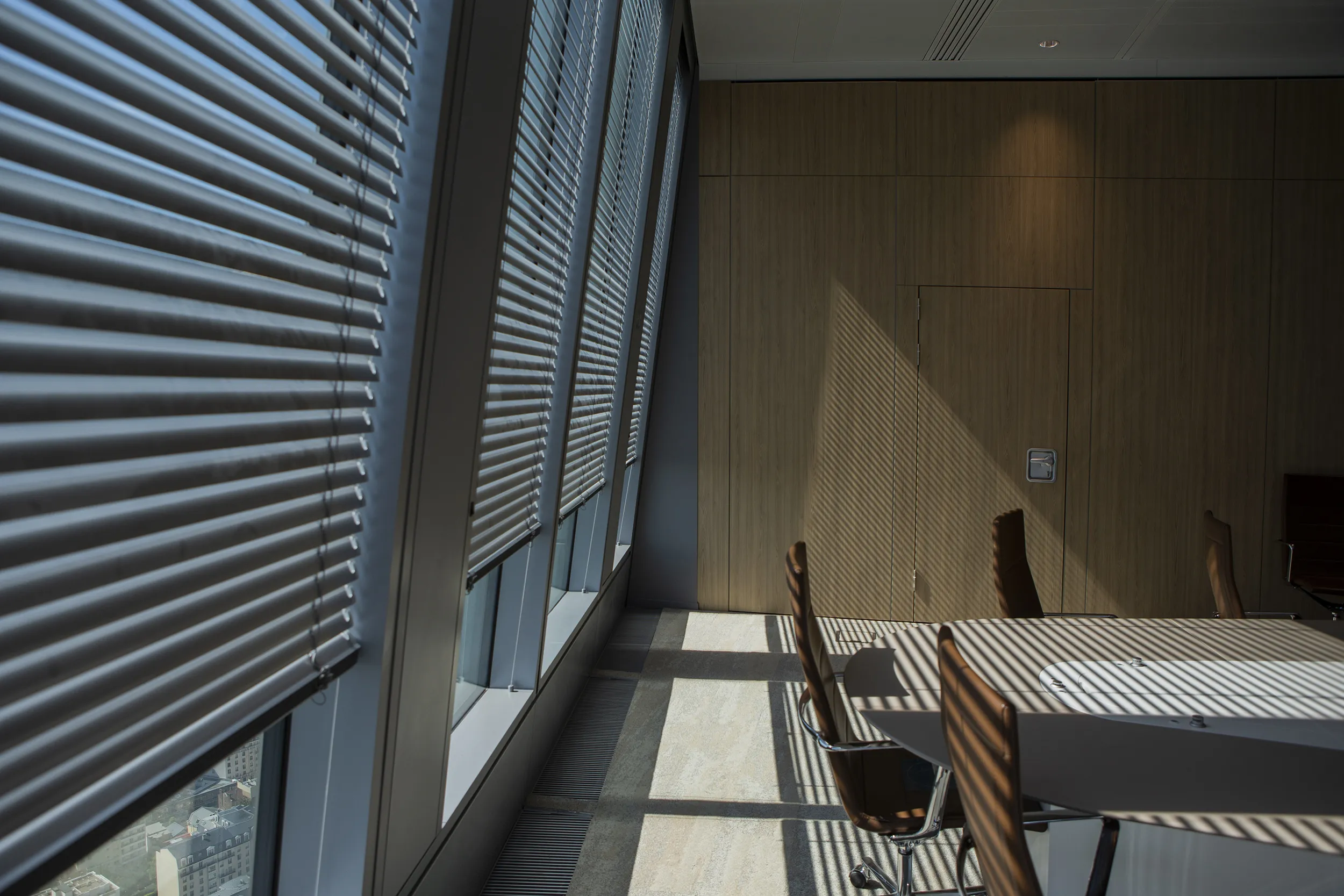 Our motorized Venetian blinds with C50 slats are integrated into this façade for complete control of light and shadow throughout the day. This efficient system reduces energy consumption for lighting and air conditioning.
