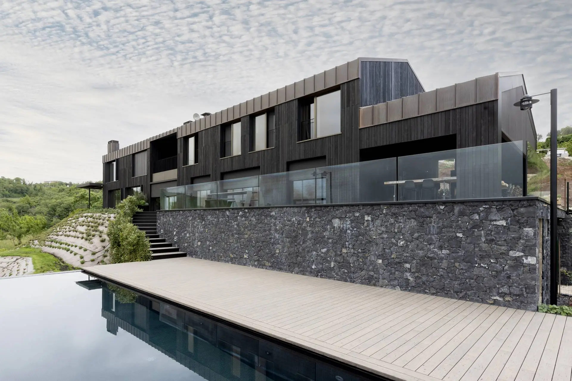 Azienda Volcanalia is clad in wood treated with a traditional Japanese technique called Yakisugi, a process that uses fire to create a charred finish.