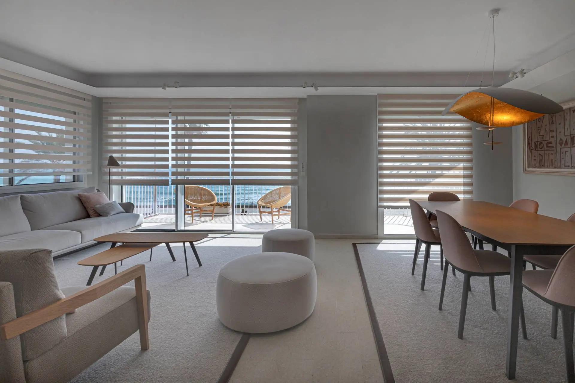 Its alternating design of translucent and blackout fabric bands glides in harmony to offer precise light control. With a single movement, you can adjust visibility and privacy, adapting the atmosphere to each moment of the day.