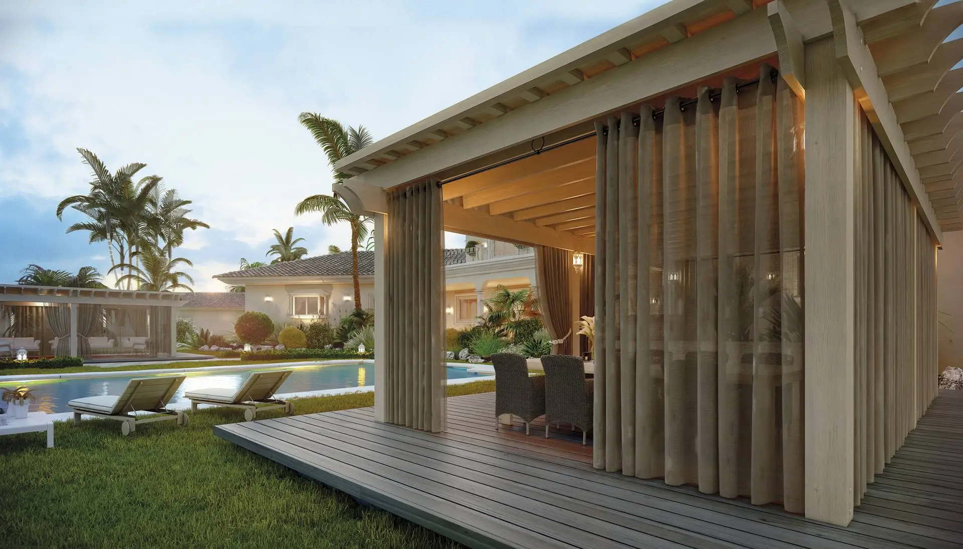 The Tendina drapery is designed for outdoor installation, thanks to its technical fabric that guarantees high resistance to weather, water, and heat. It’s a decorative solution that preserves the aesthetics of a traditional curtain, with easy maintenance and superior durability.
