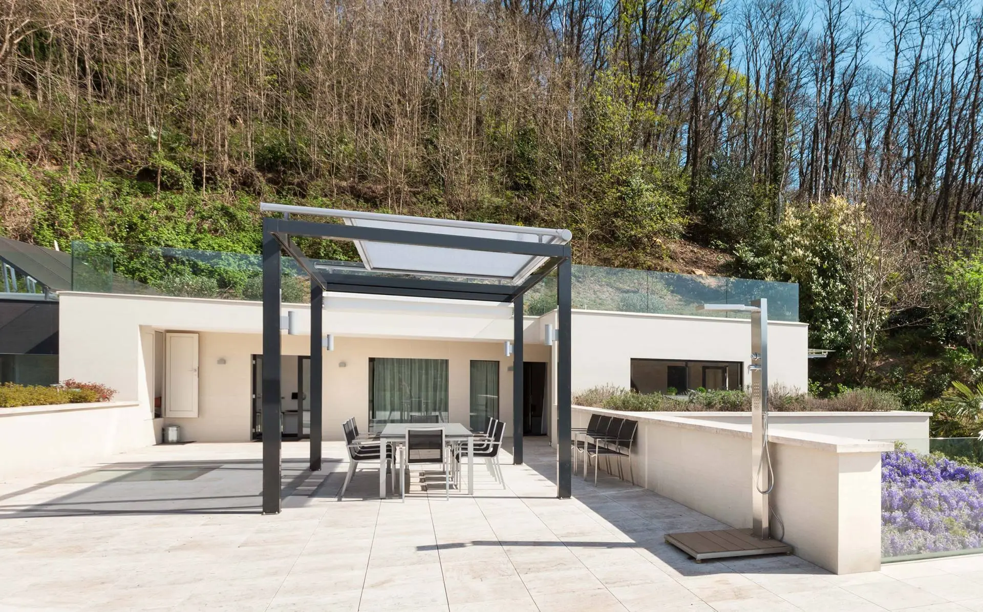 Veranda Zip is a veranda with zipper guide system that helps keep the fabric taut, which is rolled up into a 130 mm box through motorized operation.