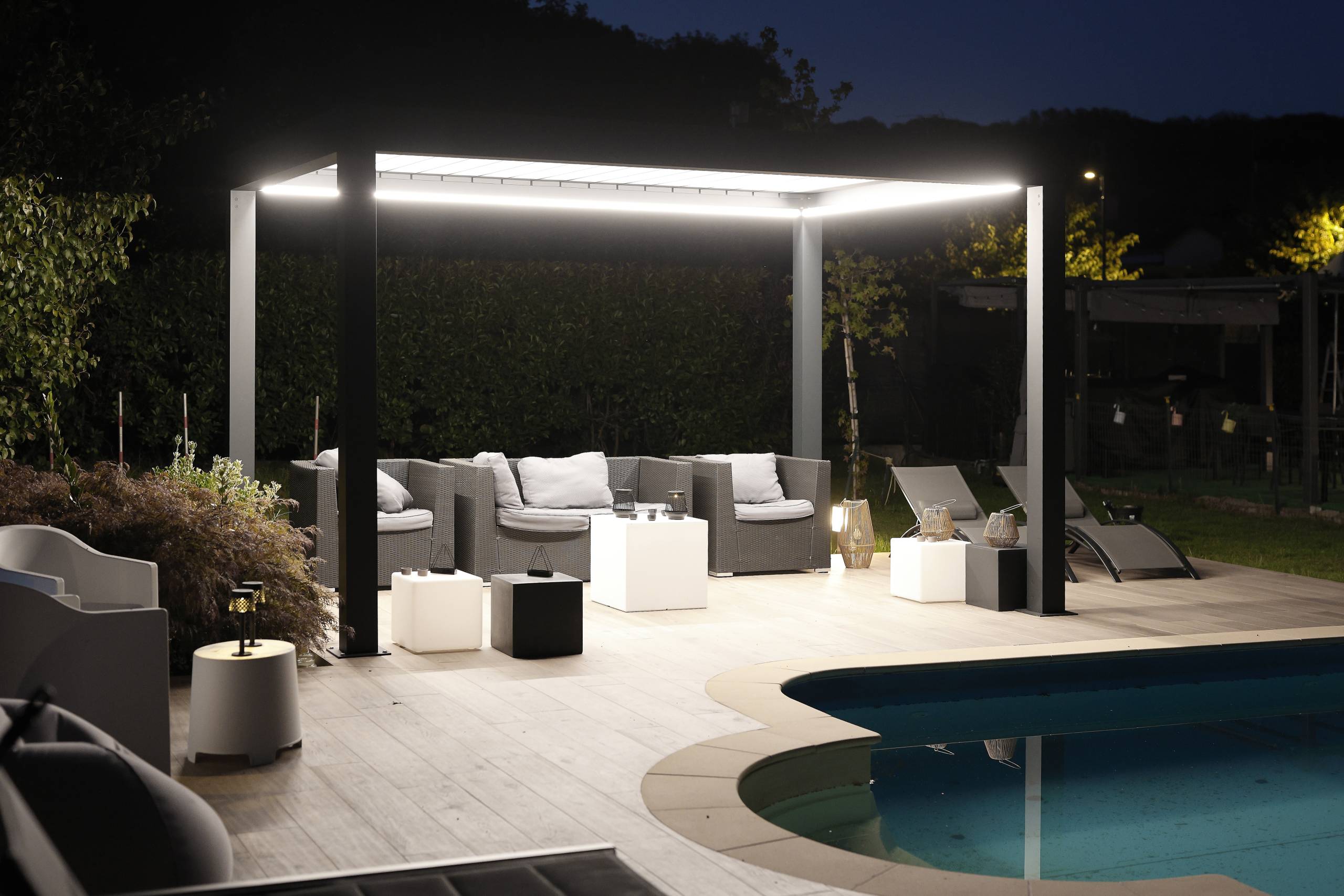 Protezione solare strutturale che ridefinisce gli spazi esterni.