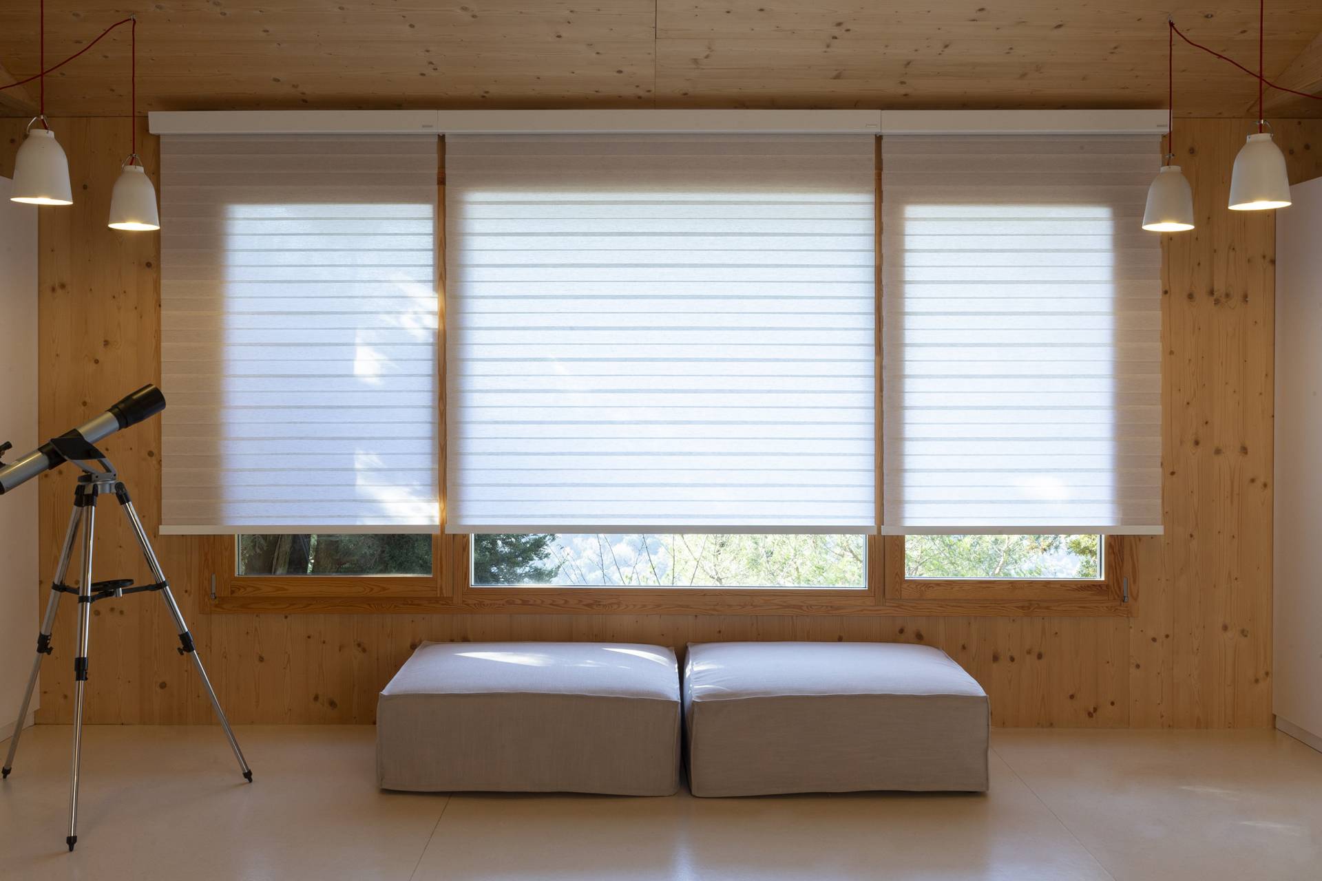 Le strisce alternate di tessuto traslucido e opaco offrono un controllo preciso dell’ingresso di luce e della privacy in ogni momento della giornata.
