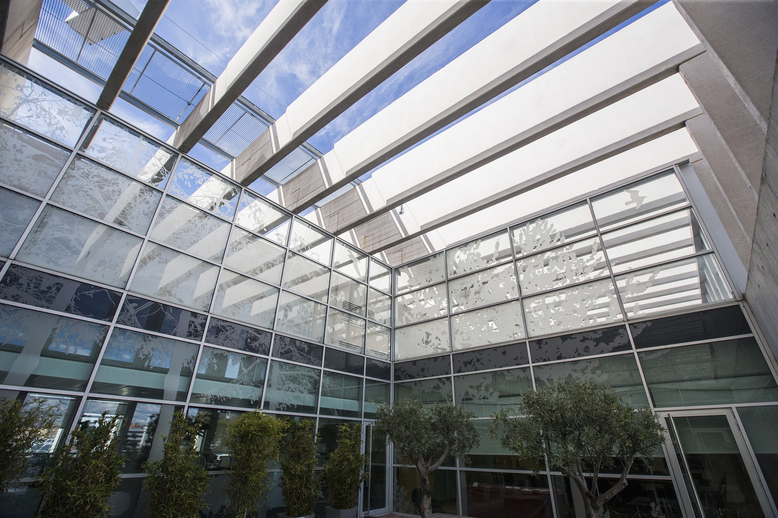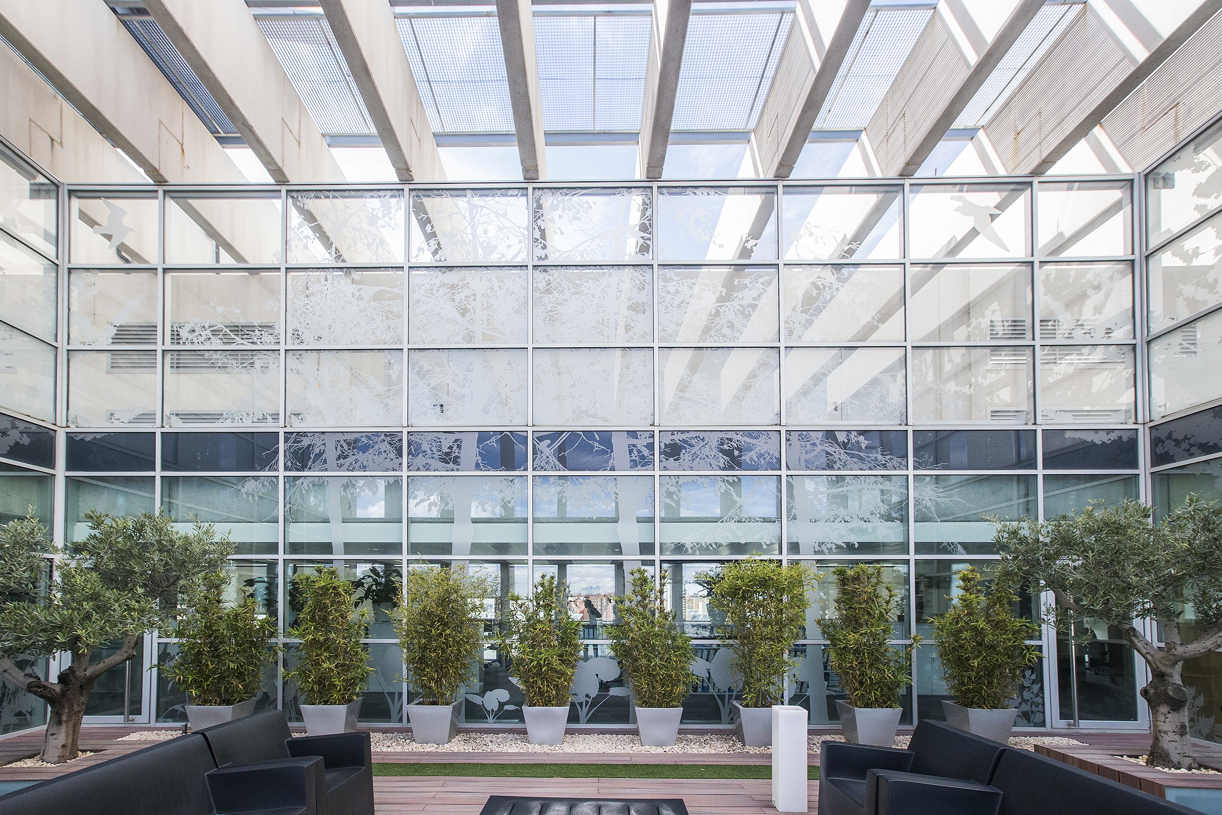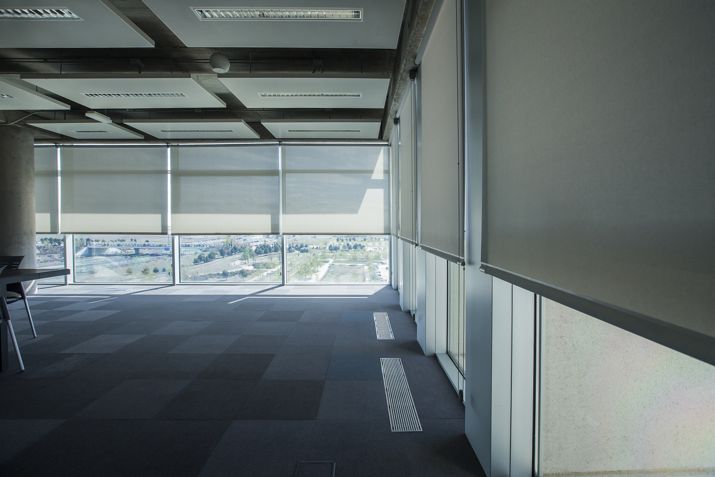 El complejo de oficinas incorpora energías renovables y medidas pasivas como acristalamientos eficientes y protección solar para optimizar el confort térmico. Las cortinas enrollables Premium Plus de Bandalux, combinadas con tejido Screen, ofrecen un reflejo solar eficaz manteniendo las vistas al exterior.