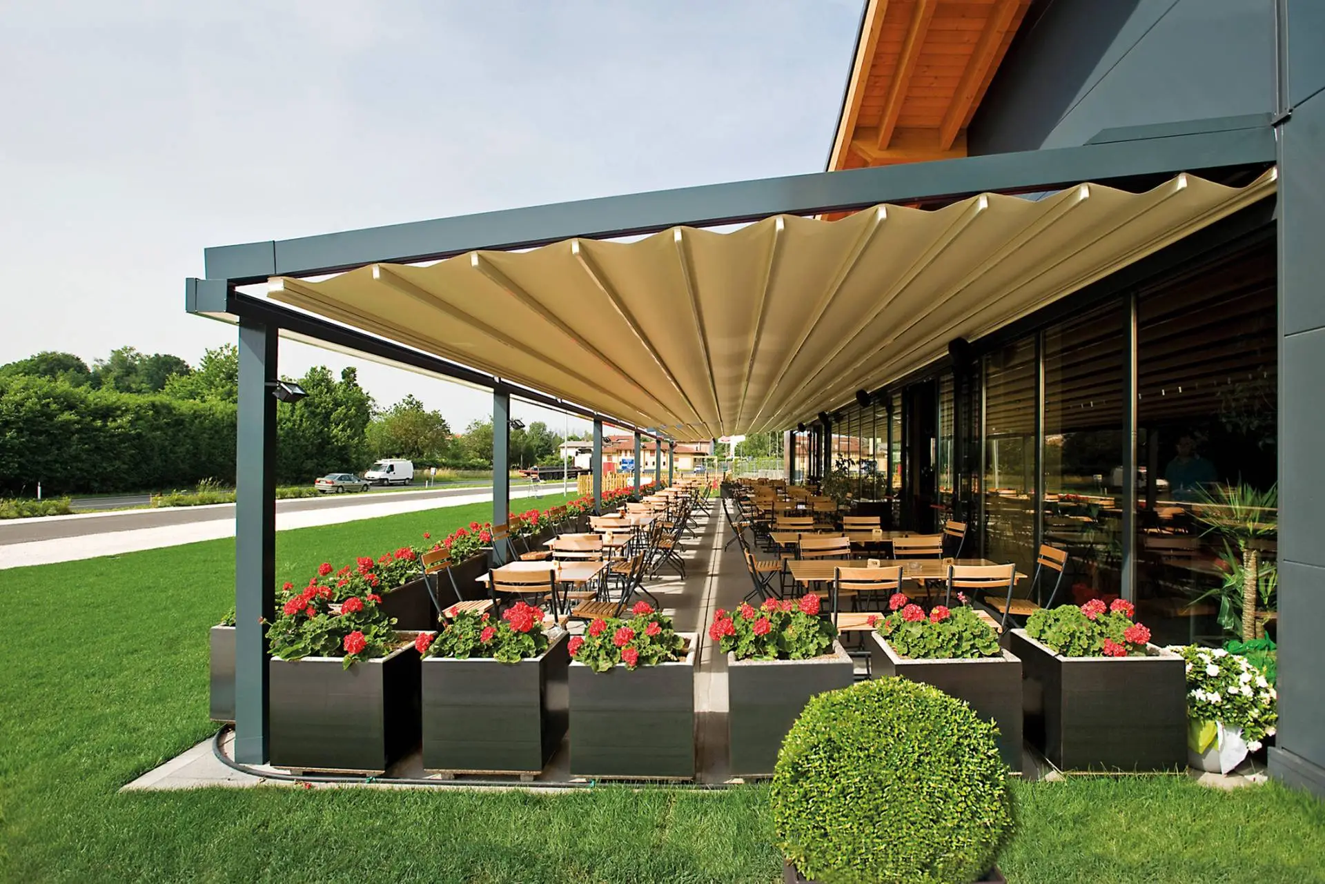 La lona tensada y extensible bloquea la radiación solar y evita filtraciones gracias a sus juntas de sellado e impermeabilización.