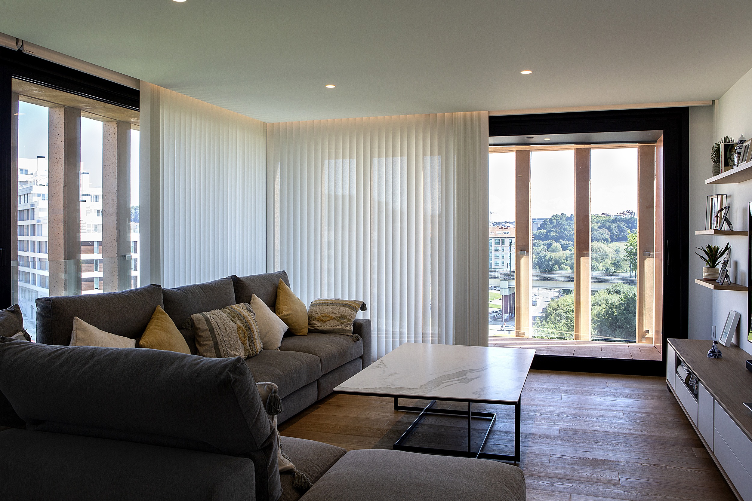 Vertical blinds and roller shades were chosen to ensure visual harmony and manage sunlight.